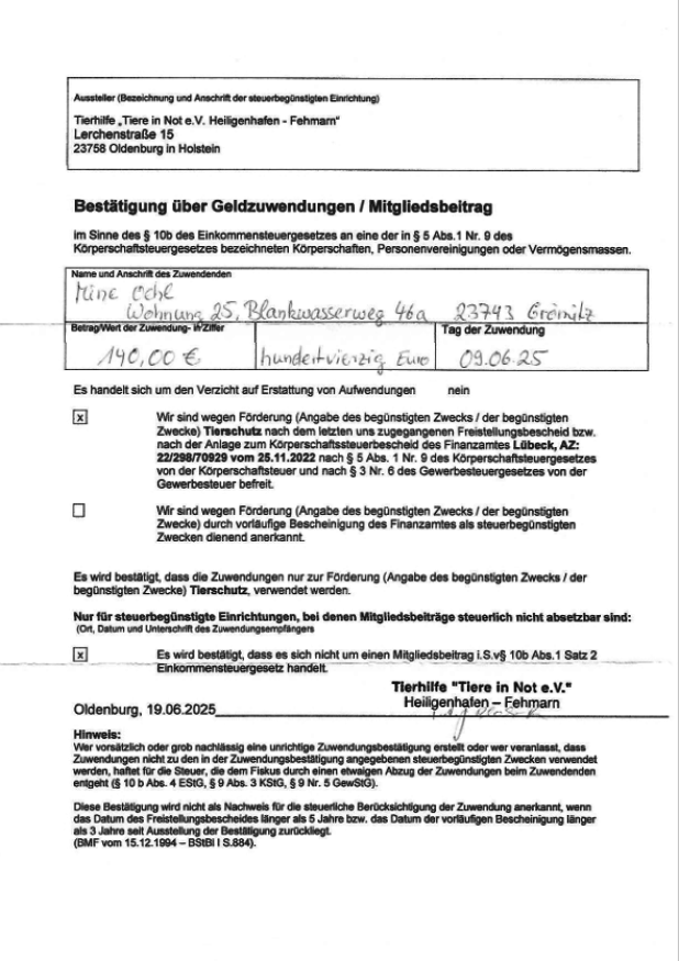 Spenden für die Tierhilfe Heiligenhafen - Fehmarn